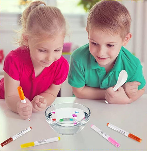 プラスチック製品に絵を描いて乾燥させた後に水に漬けると描いた絵が水に浮かび上がります。